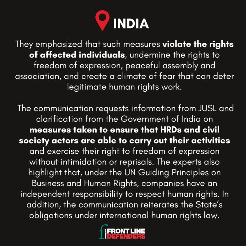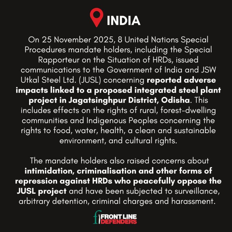 In the context of ongoing activities under the JSW Utkal Steel Ltd. (JUSL) project in Jagatsinghpur District, Odisha, the systematic intimidation and legal persecution of human rights defenders who are advocating, mobilising and speaking out against these and other