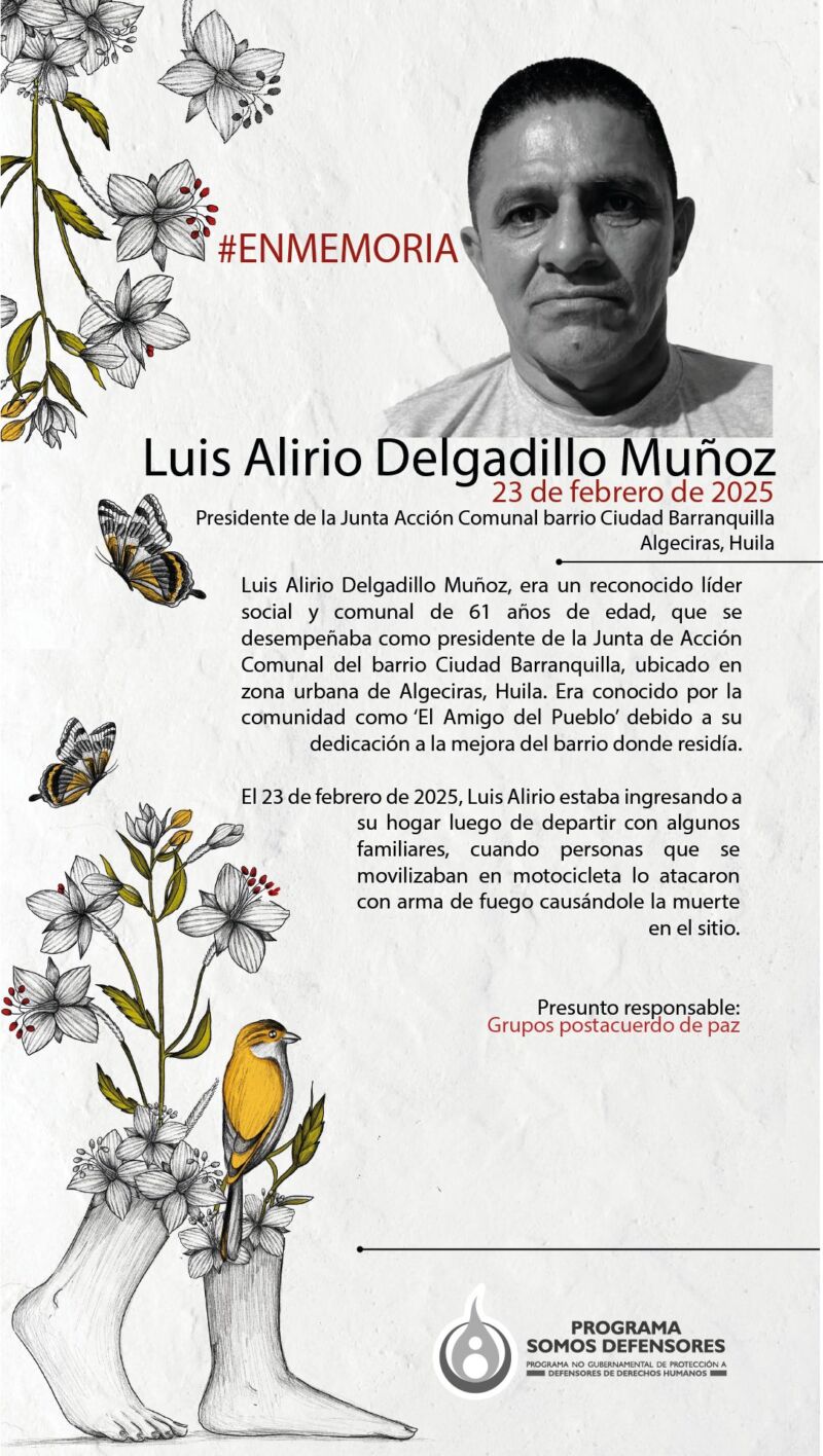 #EnMemoria Luis Alirio Delgadillo, era reconocido por su comunidad como “El Amigo del Pueblo” El 23/02/2025 fue atacado con arma de fuego cuando ingresaba a su vivienda. Defender la comunidad no debe costar la vida. Exigimos garantías para quienes ejercen liderazgo en Colombia 🕯️