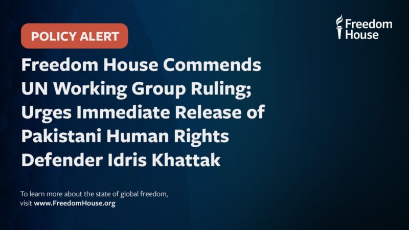 Freedom House commends the recent opinion of the UN Working Group on Arbitrary Detention (WGAD) finding that the detention of Pakistani human rights defender Idris Khattak violates international law, and calls on the Pakistani government to release Khattak without delay. Khattak
