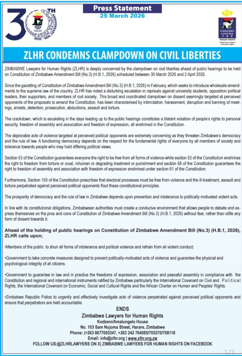 ZLHR CONDEMNS CLAMPDOWN ON CIVIL LIBERTIES
