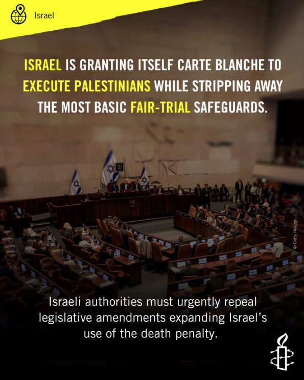 Amnesty & 30 NGOs call on the EU to act following Israel’s adoption of a death penalty law that will de facto apply exclusively to Palestinians.